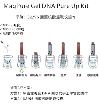 本试剂盒采用磁珠法纯化技术,只需进行简单的结合-洗涤-洗脱的步骤。切下含目的DNA片段的琼凝糖凝胶块于离心管,加入溶胶液加热溶解后转移至纯化柱中进行离心或抽滤,DNA吸附在磁珠上;杂质经过两次清洗被去除,最后用少量洗脱液或水洗脱出纯化的DNA。