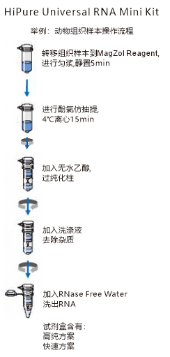 | HiPure Unviersal RNA Kits将经典的一步法RNA抽提试剂和硅胶柱纯化方式相结合,可大大提高RNA的纯度和样品的广泛性。纯化RNA可直接用于RT-PCR,芯片分析,第二代测序,cDNA文库构建等运用。组织/细胞样品经一步法RNA抽提试剂(MagZol Reagent)匀浆,加入氯仿抽提去除基因组DNA和蛋白质,得到的上清液与乙醇混匀后,转移至RNA柱子中进一步纯化RNA,经洗涤液去除杂质和盐分,最后用DEPC水洗脱出高纯度的RNA。HiPure Unviersal RNA Mini Kit适合于从小于100mg动物组织,植物组织,真菌样品,细菌,细胞等样品中提取高达200ug的总RNA。 |
