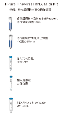 HiPure Unviersal RNA Kits将经典的一步法RNA抽提试剂和硅胶柱纯化方式相结合,可大大提高RNA的纯度和样品的广泛性。纯化RNA可直接用于RT-PCR,芯片分析,第二代测序,cDNA文库构建等运用。组织/细胞样品经一步法RNA抽提试剂(MagZol Reagent)匀浆,加入氯仿抽提去除基因组DNA和蛋白质,得到的上清液与乙醇混匀后,转移至RNA柱子中进一步纯化RNA,经洗涤液去除杂质和盐分,最后用DEPC水洗脱出高纯度的RNA。HiPure Unviersal RNA Midi Kit适合于从小于500mg动物组织,植物组织,真菌样品,细菌,细胞等样品中提取高达2mg的总RNA。