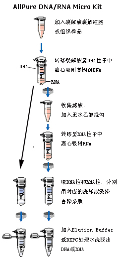 | 本试剂盒采用玻纤滤膜纯化技术,只需进行简单的结合-洗涤-洗脱的步骤。样本在含胍盐的裂解液进行破碎和匀浆,裂解物转移至DNA过滤柱离心,则DNA被高效吸附至DNA柱子中,收集含RNA的滤液,加入乙醇以提供合适的结合条件,并转移至纯化柱中并离心,高达100µg的RNA可被选择性结合到膜上,污染物经三次清洗被高效洗去,最后纯化RNA被RNase Free Water洗脱出来,最后纯化DNA被Elution Buffer洗脱出来。 | |