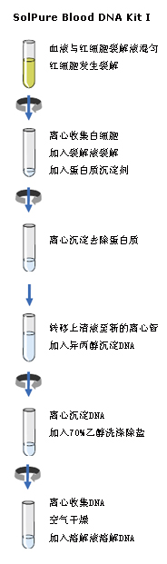 本试剂盒采用盐析法纯化方式。只需要进行简单的结合-洗涤-洗脱的步骤。取适量的血液样品、组织、白细胞或培养细胞,裂解后加入RNaseA去除RNA,加入高盐溶液盐析蛋白质和其它杂质,离心去除沉淀后得到DNA上清液,再加入异丙醇沉淀回收DNA,用70%乙醇洗涤去除盐分,最后用少量洗脱液或水洗脱出纯化的DNA。