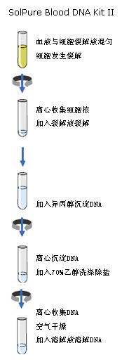 | 本试剂盒采用盐析法纯化方式。只需要进行简单的结合-洗涤-洗脱的步骤。取适量的血液样品、组织、白细胞或培养细胞,裂解后加入RNaseA去除RNA,加入高盐溶液盐析蛋白质和其它杂质,离心去除沉淀后得到DNA上清液,再加入异丙醇沉淀回收DNA,用70%乙醇洗涤去除盐分,最后用少量洗脱液或水洗脱出纯化的DNA。 | |