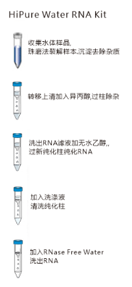 | 水体样本收集再在特殊裂解液和含有玻璃珠的管内珠磨,离心得到澄清上清加入结合液,在玻璃纤维柱内结合核酸,在通过两次清洗洗去杂质,最后用少量水洗出。 | |