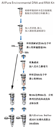 | 本试剂盒采用玻纤滤膜纯化技术,只需进行简单的结合-洗涤-洗脱的步骤。样本在含胍盐的裂解液进行破碎和匀浆,裂解物转移至DNA过滤柱离心,则DNA被高效吸附至DNA柱子中,收集含RNA的滤液,加入乙醇以提供合适的结合条件,并转移至纯化柱中并离心,高达100µg的RNA可被选择性结合到膜上,污染物经三次清洗被高效洗去,最后纯化RNA被RNase Free Water洗脱出来,最后纯化DNA被Elution Buffer洗脱出来。 | |