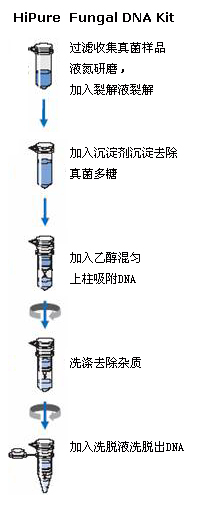 HiPure Fungal DNA Kit采用硅胶柱纯化技术,简化了从微量样本中分离DNA的步骤。无需苯酚-氯仿抽提和醇类沉淀DNA。样品经液氮研磨后,加入裂解液裂解,转移柱子后离心,DNA特异性结合到HiPure硅胶膜上,让污染物流过。PCR抑制物如二价阳离子和蛋白,可通过两步有效的洗涤步骤被完全去除,结合在离心柱上的纯DNA可用水或试剂盒中的缓冲液洗脱。HiPure Fungal DNA Kit从真菌样本中纯化得到基因组DNA和线粒体DNA,可用于 PCR和印迹实验中。 操作流程适用于各种培养的真菌,寄生真菌以及大型真菌。