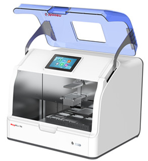 | Magmix 96全自动高通量核酸提取仪采用磁棒拍打和转移方式,使待检样本在合适的条件下自动进行裂解、核酸与磁珠结合、磁珠转移和分离、洗脱释放,从而实现从样本中分离提纯核酸。与其他提取方法相比,Magmix系列全自动核酸提取仪配套预分装试剂操作更为简便快捷,可实现全自动化核酸提取。该仪器可同时进行1-96个样本的提取,用户只需通过触摸屏的简单操作就可实现实验程序编辑、实验状态监控、开关紫外 灯消毒等功能,具有操作简便、提取快速、结果可靠的特点Magmix 96核酸提取仪采用96孔深孔板和96磁套作为提取耗材,深孔板底部和加热模块充分接触,大大提高孔间的温度均匀性,从而减少了提取造成的孔间差异。Magmix 96核酸提取仪配合相应的磁珠法核酸提取试剂,可以快速提取动植物组织、血液、体液、食品、病原微 生物等样品中的DNA和RNA。提取仪用于生物样本的核酸提取纯化,适用于临床检测、常规科研、基因组学分 析、疾控系统、食品安全检验、法医鉴定等领域。 |